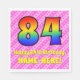 This happy and festive 84th birthday-themed paper napkin design features a large number "84" having a colorful pattern inspired by the appearance of a rainbow spectrum. It also features the message "Happy 84th Birthday,", and a custom name. The background features a dark pink and light pink stripes pattern containing loving pink heart shapes. Birthday themed paper napkins like this might be used at a party celebrating somebody’s eighty fourth birthday. [~Z0000417]