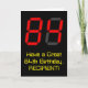 The front of this silly and nerdy birthday themed greeting card design features a large number "84" having a red seven segment digital display style appearance, along with the message "Have a Great 84th Birthday," and an editable name, on a black colored background. The inside features an editable birthday greeting message, or could perhaps be cleared and left blank if a message is to be written by hand instead. A customizable birthday card like this might be a fun way to send birthday wishes to somebody who is celebrating their eighty fourth birthday. [~Z0000386]