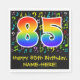 This fun, vibrant, and colorful birthday-themed paper napkin design features a large number "85" having a rainbow spectrum gradient inspired pattern. It also features the message "Happy 85th Birthday,", and a customizable name. Part of the background has a colorful music notes and symbols pattern. Fun, personalized paper napkins like this might be used at a celebration being held to honor a musician’s, a singer’s, a composer’s, or somebody else’s eighty fifth birthday. [~Z0000421]