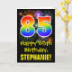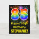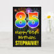 The front of this exciting, fun, and colorful birthday greeting card design features a large number "85" having a rainbow spectrum gradient inspired pattern. It also features the message "Happy 85th Birthday,", and an editable recipient name. The front additionally features a colorful background pattern inspired by the look of bursting celebratory fireworks. The inside features a customizable birthday greeting message, or could perhaps be cleared and left blank if a message is to be written by hand instead. A personalized birthday card like this might be a fun way to acknowledge somebody’s eighty fifth birthday. [~Z0000442]