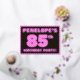 The front of this bold and fun eighty-fifth birthday party/celebration foil announcement/invitation card features an editable name, a large number “85th”, the message “BIRTHDAY PARTY!”, and a border, all featuring a feminine dark pink and light pink striped pattern. The back features personalized details about the event, such as the date, time, venue, and any other important information. Customizable invitations like these might be used to invite attendees/guests to a birthday gathering being held in celebration of somebody’s 85th birthday. [~Z0000597]