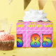 This upbeat and cheerful 85th birthday themed wrapping paper design features a large number "85" having a colorful pattern inspired by the look of a rainbow spectrum. It also features the message "Happy 85th Birthday,", followed by a customizable name. The background features a light pink and dark pink stripes pattern containing loving pink heart shapes. Wrapping paper like this might be used when giving a gift or present in honor of somebody’s 85th birthday. [~Z0000415]