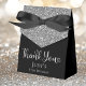 This fabulous modern 85th Birthday Silver Glitter Black Thank You favor box with sparkling silver glitter, Thank You in a trendy script font and the birthday girl's name in silver with an elegant black bow would be perfect for your event. It would be great for a candy station, on a thank you gift table, or at each place setting with a favor. Be sure you order enough for all your guests.