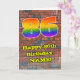 This exciting and fun urban street art and graffiti inspired birthday greeting card design features a large number “86” having a colorful rainbow spectrum gradient inspired pattern. It also features the message “Happy 86th Birthday,”, and a personalized name. The background of the front has a brick wall pattern. The inside features a customizable birthday greeting message, or could perhaps be cleared and left blank if a message is to be written by hand instead. A vibrant, customized birthday greeting card like this might be sent to celebrate somebody’s eighty-sixth birthday. [~Z0000586]