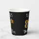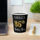 This ornate and luxurious birthday themed paper cup design features an editable name and the message “86th Birthday Party”. The large number “86th” has an imitation/faux gold-inspired coloring pattern, and the words “Birthday Party” are in fancy script-style text. The background is colored black by default (although it can be customized). Opulent, fancy paper cups like this might be useful at a birthday celebration/party being held to celebrate somebody’s 86th birthday. [~Z0000567]
