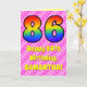 The front of this cheerful and fun 86th birthday themed greeting card design features a large number "86" having a colorful pattern inspired by the appearance of a rainbow spectrum. It also features the message "Happy 86th Birthday,", and a customizable recipient name. The background of the front features a dark pink and light pink stripes pattern containing loving pink heart shapes. The inside features an editable birthday greeting message, or could perhaps be cleared and left blank if a message is to be written by hand instead. A personalized birthday card like this might be a fun way to acknowledge somebody’s eighty sixth birthday. [~Z0000416]