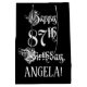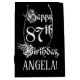 This elaborate and fancy birthday giftbag design features the message “Happy 87th Birthday,” in lavish script style text, on a black colored background. It also has a customizable recipient name. A birthday themed gift bag like this might be used when giving a gift or present in celebration of somebody’s 87th birthday. [~Z0000557]