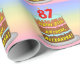 This joyful and upbeat birthday wrapping paper design features a cartoon-style depiction of a three-tier birthday cake having numeral-shaped candles on top showing the number “87“, along with the message “HAPPY 87TH BIRTHDAY,”, and an editable recipient name. The background features a multi-color pastel rainbow spectrum inspired gradient pattern. Birthday themed wrapping paper like this might be used when giving a gift or present in celebration of somebody’s 87th birthday. [~Z0000622]