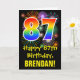 The front of this colorful, exciting, and fun birthday themed greeting card design features a large number "87" with a rainbow spectrum gradient inspired pattern, along with the message "Happy 87th Birthday,", and a customizable recipient name. The front additionally has a colorful background pattern inspired by bursting celebratory fireworks. The inside features a personalized birthday greeting message, or could perhaps be cleared and left blank if a message is to be written by hand instead. A birthday card like this might be a fun way to send birthday wishes to somebody who is celebrating their eighty seventh birthday. [~Z0000442]