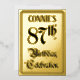 The front of this ornate and elegant eighty-seventh birthday celebration/party foil announcement card design features the message “87th Birthday Celebration” in fancy script-style text. It also features an editable name. The back features personalized details about the event, such as the date, time, venue/location, and any other information that may be relevant. Elaborate, luxurious, customizable invitations like these might be used to invite guests to a birthday party being held to celebrate somebody’s 87th birthday. [~Z0000596]
