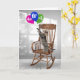 Playful tabby cat standing on a wooden rocking chair and reaching for a colorful balloon bouquet for 88th birthday.