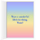 This joyful and cheerful birthday themed greeting card design features a cartoon-style depiction of a three-tier birthday cake having numeral-shaped candles on top showing the number “88“, along with the message “HAPPY 88TH BIRTHDAY,”, and an editable recipient name. The background of the front has a multicolored pastel rainbow spectrum inspired gradient pattern. The inside features a custom birthday greeting message, or could perhaps be cleared and left blank if a message is to be written by hand instead. A fun, customizable birthday greeting card like this might be sent in celebration of somebody’s eighty-eighth birthday. [~Z0000626]