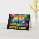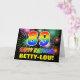 The front of this fun, colorful, and cheerful birthday themed greeting card design features a large number "89" and the message "HAPPY BIRTHDAY,", both colored with a rainbow spectrum gradient inspired pattern, along with a bold yellow customizable recipient name. The front also features a multicolored background pattern inspired by the appearance of bursting celebratory fireworks. The inside features a customizable birthday greeting message, or could perhaps be cleared and left blank if a message is to be written by hand instead. A colorful customizable birthday card like this might be a fun way to send a message celebrating somebody’s eighty ninth birthday. [~Z0000471]