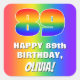This cheerful and fun birthday square sticker design features a large number “89” with a colorful rainbow spectrum inspired gradient pattern, along with the message “HAPPY 89th BIRTHDAY,”, and a personalized recipient name. The background also features an exciting multicolored rainbow spectrum inspired gradient pattern. Fun, personalized stickers like this might be given as a birthday present, or used while wrapping presents, or perhaps used as a birthday party decoration when celebrating somebody’s 89th birthday. [~Z0000571]