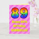 The front of this happy and festive 89th birthday themed greeting card design features a large number "89" having a colorful rainbow spectrum inspired gradient pattern. It also features the message "Happy 89th Birthday,", and a personalized recipient name. The background of the front features a dark pink and light pink stripes pattern containing loving pink heart shapes. The inside features a personalized birthday greeting message, or could perhaps be cleared and left blank if a message is to be written by hand instead. A customizable birthday card like this might be a fun way to send birthday wishes to somebody who is celebrating their eighty ninth birthday. [~Z0000416]