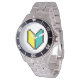 Has heft and feel of expensive stainless steel quartz watches. Good band with safety catch. I removed links, which is easy because engraved arrows show direction to push the linking pins. As always by this seller, the image (a railroad logo) is a perfect reproduction of my emailed image, and is precisely spaced and aligned.