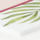 The text is inside a pink arch with burgundy red borders. Around the arch, there are tropical flowers and leaves - monstera and palm leaves and pink hibiscus - painted in watercolor. The title "Aloha" and the names are written in handwriting script, in a burgundy red similar in color with the center of the hibiscus flowers, the rest of the text is black (all caps).