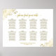 This beautiful wedding seating chart features a chic sophisticated design with gold text on a white background. The title is an elegant script calligraphy reading: please find your table. The corners are decorated with gold faux foil frills in a delicate floral pattern. Includes seating for 8 tables or 80 guests with 10 seats per table. Wonderful way to help your guests find their tables at your reception while adding a touch of style.
