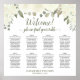 This 8 table wedding seating chart features a rustic floral boho chic design with hand painted watercolor roses, blossoms, and greenery in shades of ivory, white, and cream. The title reads "Welcome! please find your table" written in elegant sage green or olive colored script calligraphy. There is space for the names of the couple and wedding date at the bottom. This chart has table assignments for 80 guests with 10 seats per table. Beautiful way to welcome your guests while making it easy for them to find their seats.