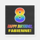 This colorful, cheerful, and fun birthday paper napkin design features a large number "8" and the message "HAPPY BIRTHDAY,", both having a rainbow spectrum gradient inspired pattern coloring, along with a bold yellow personalized recipient name. The background is colored black. Fun, customized birthday themed paper napkins like this might be used at somebody’s 8th birthday celebration. [~Z0000476]