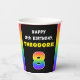 This joyful and bold birthday-themed paper cup design features a big number “8“ having a multicolored rainbow spectrum inspired gradient pattern, along with the message “HAPPY 8th BIRTHDAY,”, and a custom recipient name. Cheerful birthday themed paper cups like this might be used at a birthday party for somebody who is celebrating their 8th birthday. [~Z0000639]