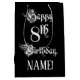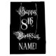 This lavish and fancy birthday-themed gift bag design features the message “Happy 8th Birthday,” in opulent script style text, on a black colored background. It also has a customizable recipient name. A birthday themed giftbag like this might be a respectable way to wrap a gift or present being given to celebrate somebody’s eighth birthday. [~Z0000557]