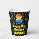 This exciting and colorful music-themed birthday paper cup design features a large number “8” with a rainbow spectrum gradient inspired pattern, along with the message “Happy 8th Birthday,”, and a custom name. The background features a colorful pattern of various music notes and symbols having a variety of colors and sizes. Vibrant, colorful paper cups like this might be fun to have at a birthday celebration/party being held to honor somebody’s eighth birthday. [~Z0000541]