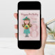 Little choir girl singing "Happy Birthday to you" with eyes closed and mouth open wide. Girl has flowers in her hands and a ribbon in her blond hair. Distressed pink background and subtle 8 on the front symbolizing her 8th birthday.