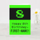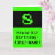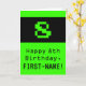 The front of this fun and nerdy birthday-themed greeting card design features a large green classic video game style number "8". It also features the birthday greeting message "Happy 8th Birthday,", and a personalized name. The inside features a personalized birthday greeting message, or could perhaps be cleared and left blank if a message is to be written by hand instead. A geeky birthday card like this might be a fun way to send birthday wishes to somebody who is celebrating their eighth birthday. [~Z0000430]