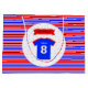 This 8th birthday gift bag is brightly colored, and great for both boys and girls. Add the name of the birthday girl or boy to personalize it. The red birthday banner declares "BIRTHDAY" in black capital letters - or this too can be edited. The red and blue stripes match the striped tissue paper also available in the collection.