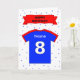 This fun 8th birthday card features a blue and red sports shirt, with a large white number 8 and space for you to personalize it with the child's name. At the top, the red birthday banner carries the message "Happy Birthday", and there is a scattering of small blue stars on a white background.