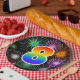 This colorful, cheerful, and fun paper plate design features a large number "8" colored with a rainbow spectrum gradient inspired pattern. It also features a vibrant and exciting bursting celebratory fireworks inspired pattern. It has a black colored background. Fun paper plates like this might be used at a party being held to celebrate somebody’s 8th birthday, an eighth anniversary, or some other 8th event. [~Z0000490]