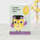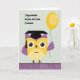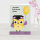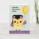 8th grade graduation with a wise Owl in a graduation cap, holding a yellow balloon. The Owl is yellow and purple and the graduation cap is black. Perfect card for the occasion.