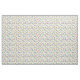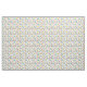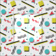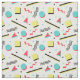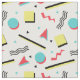 Fun fabric featuring a fabulous 90s inspired pattern with circles, triangles, squares and other shapes in coral red, yellow, turquoise, and black.