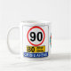 Personalized 90th birthday celebration funny road sign coffee mug. Party fun gift for those 90 year old men and women. A unique special age milestone for family or friends with 80 zone ends crisis ahead. Add their name and date of birth to this over the hill style gift. Cute and bold typography for those entering their 90s. Create your own special surprise using the template supplied. Excellent for a father or mother, brother or sister and of course that best friend with a sense of humor.