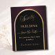A Save the Date card for a 90th birthday party. A black and burgundy background, decorated with a faux gold arch. Personalize and add a date and your name. The text: Ninety and Save the Date is written with a large trendy hand lettered style script.