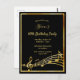 A trendy, modern 90th birthday party invitation card for both men and women. A classic black background, with faux gold frame and music notes, golden colored letters. Templates for your party information. Back: white background.