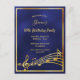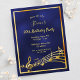 On front: A trendy, modern 90th birthday party invitation card for men. A dark blue, navy blue background. The blue color is uneven. With a faux gold frame and music notes, golden colored letters. Templates for your party information. Back: white background.