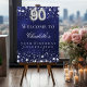 A welcome board for a 90th birthday party. A navy blue background with elegant faux silver stars. The blue color is uneven. Personalize and add a name and text. White letters.