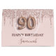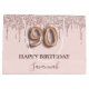Elegant, classic, glamorous and girly for a 90th birthday party. A blush pink background. Decorated with rose gold, pink faux glitter drips, paint dripping look. Personalize and add a name. With the text: Happy Birthday. The name is written with a modern dark rose colored hand lettered style script. Number 90 is written with a balloon style font.