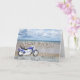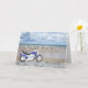 A blue motor cycle standing on a beach with fluffy clouds in the sky. Happy Birthday written in rock reflected in the water lying on the sand.