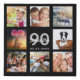 A unique 90th birthday gift or keepsake, celebrating her life with a collage of 8 of your photos. Add images of her family, friends, pets, hobbies or dream travel destination. Personalize and add a name, age 90 and a date. White and gray colored letters. A chic black background. This canvas is also available in our store with white or rose gold colored background.