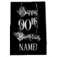 This fancy and elaborate birthday themed gift bag design features the message “Happy 90th Birthday,” in luxurious script style text, on a black colored background. It also has a personalized recipient name. A lavish birthday themed gift-bag like this might be used when giving a gift or present in celebration of somebody’s ninetieth birthday. [~Z0000557]