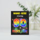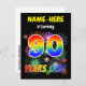 The front of this fun and vibrant birthday party invitation postcard design has a personalized name, a lively bursting celebratory fireworks inspired pattern, and the message "90 YEARS OLD!" having a colorful rainbow spectrum inspired gradient pattern. The back features a customizable message that could describe when and where the party is being held, in addition to other relevant information. Invitation postcards like this could be sent to potential attendees of a party being held to celebrate the birthday of somebody who is turning 90 years old. [~Z0000452]