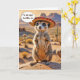 A meerkat stands upright wearing a colorful sombrero in a desert landscape with cacti and mountains in the background for a 90th birthday