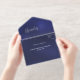 A navy blue background. The blue color is uneven. Personalize and add name, party details, RSVP date, return address and name. Ninety with a heart. Silver foil inside.