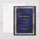 A trendy, modern 90th birthday party invitation card for men, guys, male. A dark blue, navy blue background. The blue color is uneven. With a faux gold frame and golden confetti sprinkle, golden colored letters. Templates for your party information.