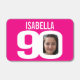 Happy Birthday 90 photo bright hot pink and white favors. Celebrate a 90th Birthday with these fun graphic add your own photo matches. Personalize with a photograph of the birthday girl. Great idea for adding some fun to a ninetieth birthday party. Add your own name or thanks as required. Ideal to be given out as favors to your birthday party guests. Other colors and ages available. Exclusive design by Sarah Trett for www.mylittleeden.com