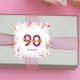 A sticker for a girly 90th birthday party. Branches with pink, purple and golden magnolia flowers. Elegant white background. Templates for a name, age 90 and a date. Date of birth or the date of the party/anniversary. Golden and burgundy colored letters. The name is written with a modern hand lettered style script.