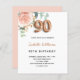 An elegant invitation for a 90th birthday party. A chic white background. Decorated with a rose gold and blush pink watercolored rose flower, floral, green eucalyptus leaves, sprigs, greenery and faux gold sprigs. Personalize and the name and party details. Black and golden letters. The name is written with a modern hand lettered style script. Number 90 is written with a golden balloon style font.
